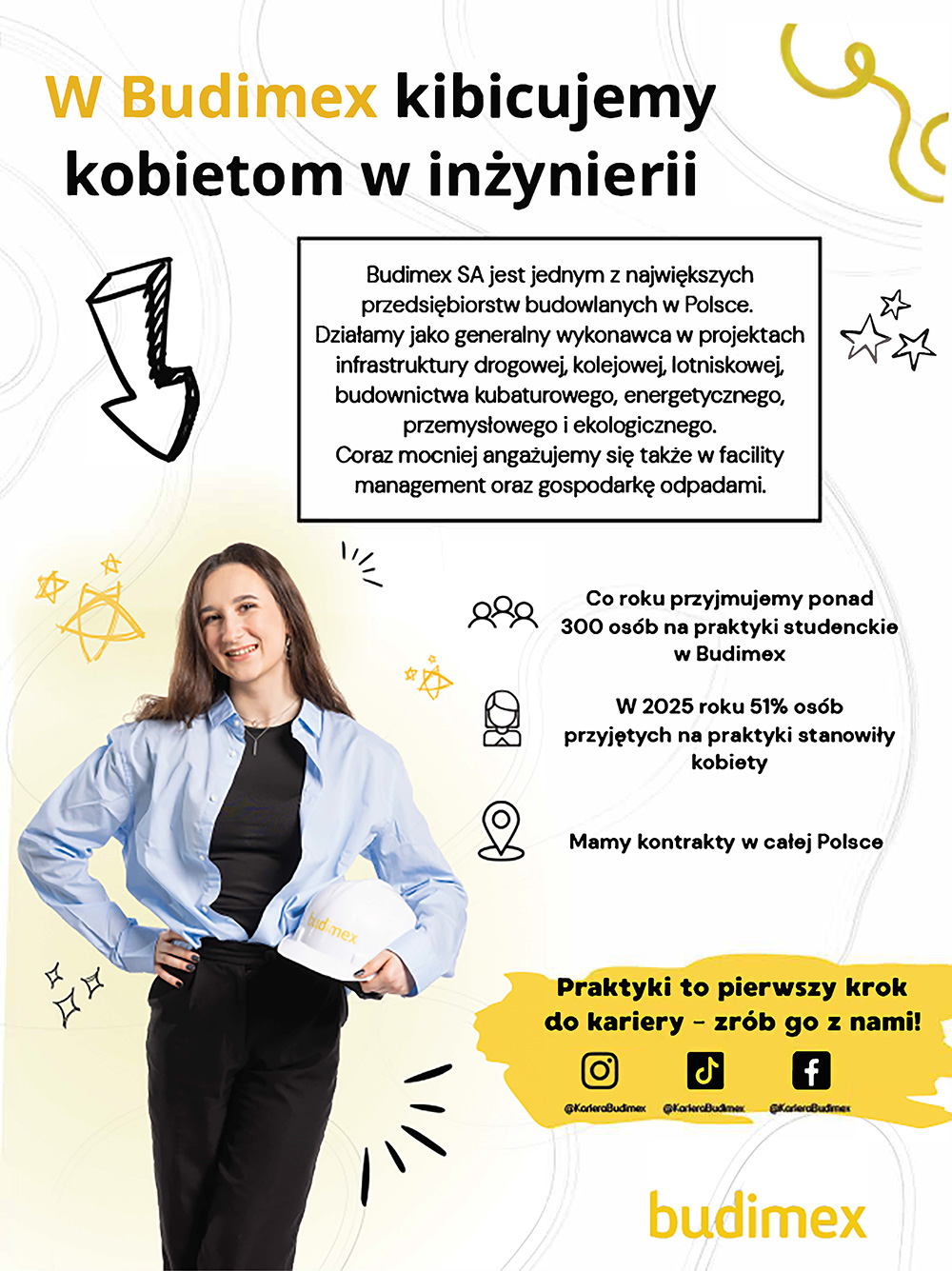 Budimex aktywnie wspiera kobiety w branży. W zeszłorocznej edycji programu praktyk skierowanego do studentów 51% uczestników stanowiły kobiety. Jesteśmy dumni z ich zaangażowania, kompetencji i pasji. Kobiety w Budimex pełnią odpowiedzialne funkcje – niektóre z nich rozpoczynały swoją przygodę od praktyk.